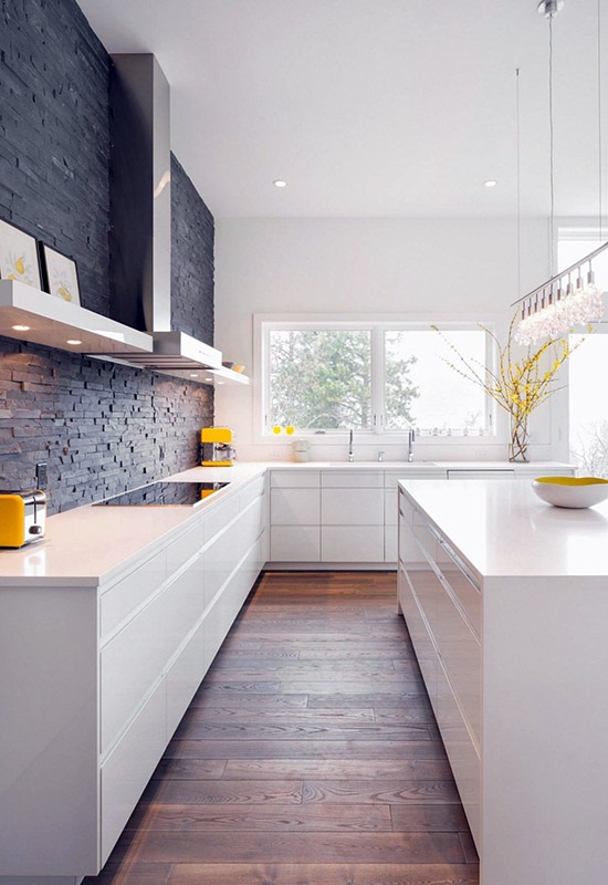 Кухни в стиле минимализм подразумевают использование как можно меньшего количества мебели и декора, дабы придать помещению визуального пространства. Для данного стиля характерно использование светлой отделки, ярких элементов декора, большого количества натурального и искусственного освещения.