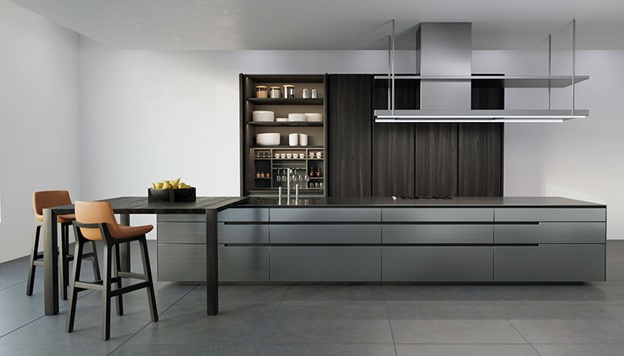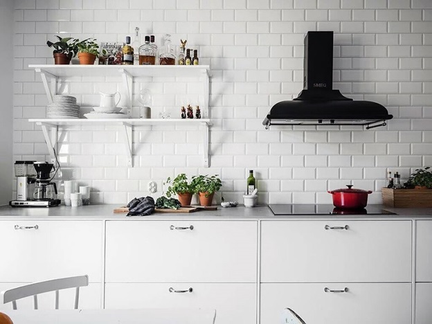 В классической кухне вытяжка, как правило, скрывается в одной из навесных систем. Если останавливать свой выбор на кухне без верхних шкафчиков, то: